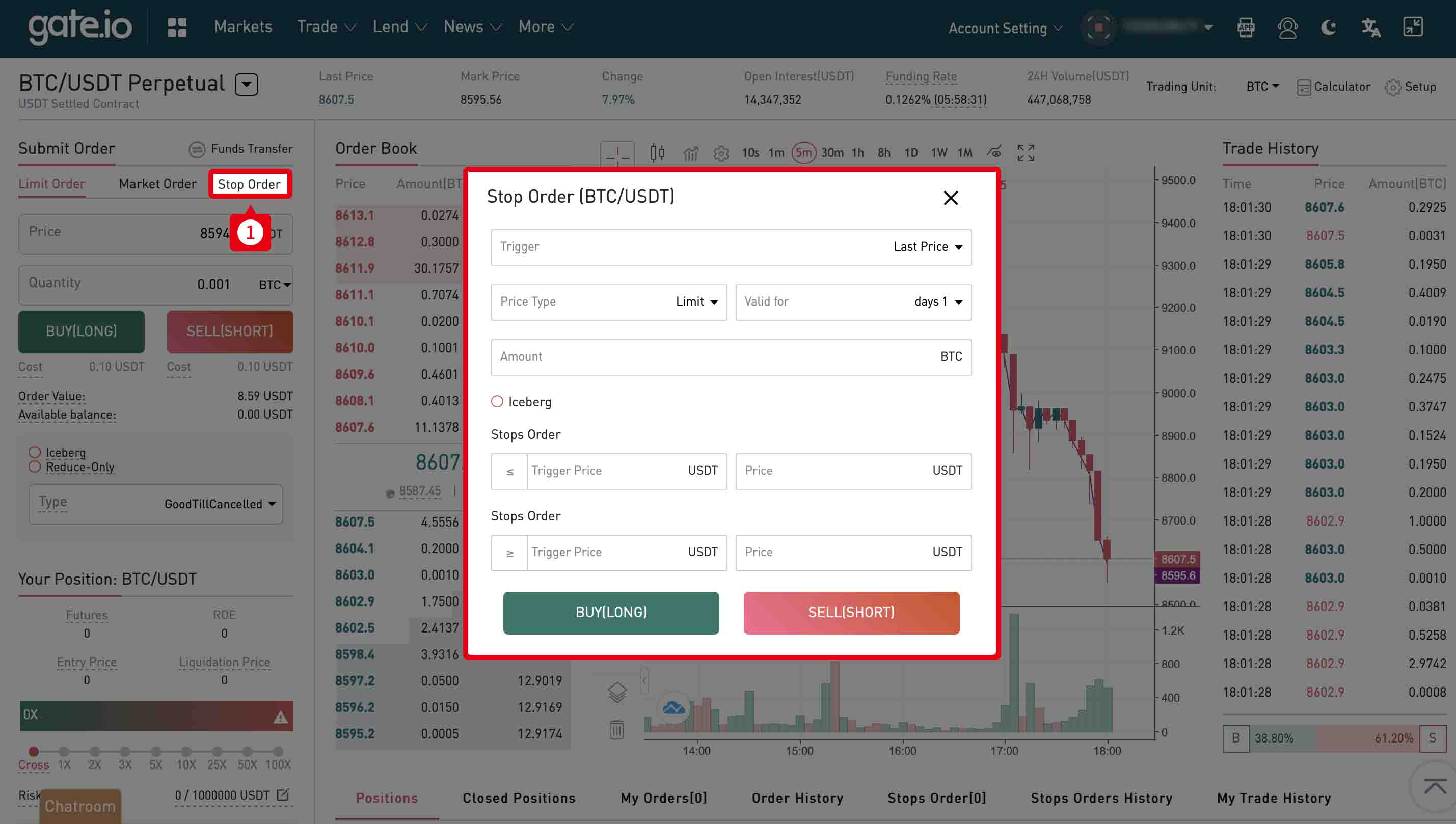 Enter the Perpetual Contract Trading page, and click “Stop Order” under “Submit Order”on the left side to place stop orders, and place buy and sell open orders.