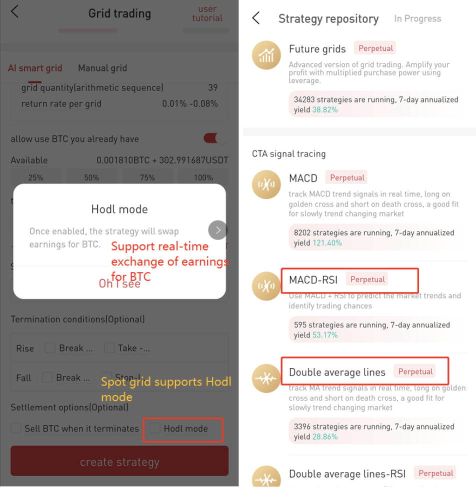 1.Spot grid supports hodl mode, and users can exchange earnings for BTC in real time.