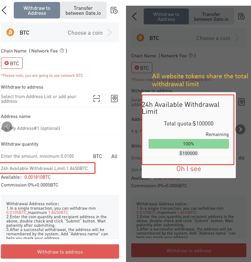 2.Withdrawal limit upgraded to a shared limit for the whole site. In addition, this new update has added a 24h available withdrawal limit, available limit and displayed a percentage progress in a pop-up
