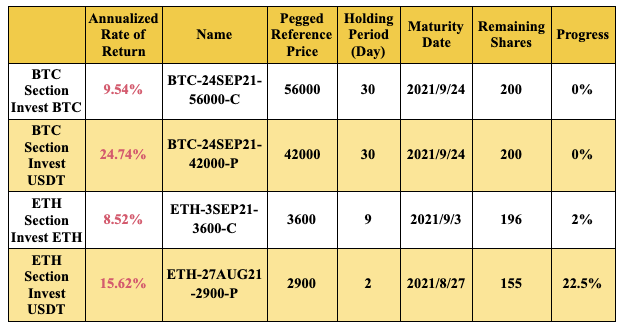 - settlement price > pegged price, and settlement currency is USDT, settlement amount = (1 +return rate) * pegged price * amount of purchases.