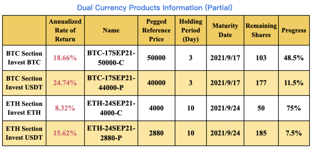 Risk warning: dual currency financial product is a floating income non-principal-protected wealth management product, and the final settlement will be determined by the settlement price and the linked price. Therefore, the risk mainly lies in the high volatility of the market price. Users are advised to invest carefully after understanding the risk. Generally speaking, the shorter the settlement date maturity, the lower the annualized return; in addition, if the linked price is higher, the annualized return is relatively lower. You can choose different products according to your risk appetite.