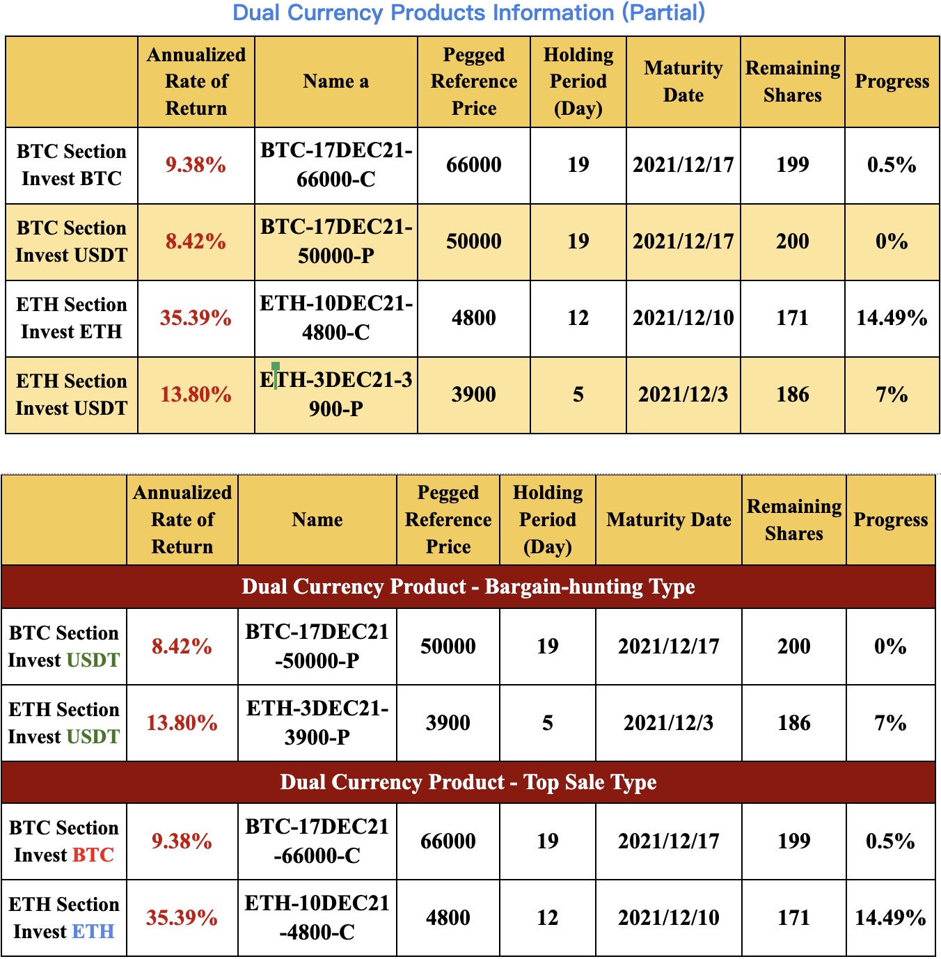 Risk warning: dual currency financial product is a floating income non-principal-protected wealth management product, and the final settlement will be determined by the settlement price and the linked price. Therefore, the risk mainly lies in the high volatility of the market price. Users are advised to invest carefully after understanding the risk. Generally speaking, the shorter the settlement date maturity, the lower the annualized return; in addition, if the linked price is higher, the annualized return is relatively lower. You can choose different products according to your risk appetite.