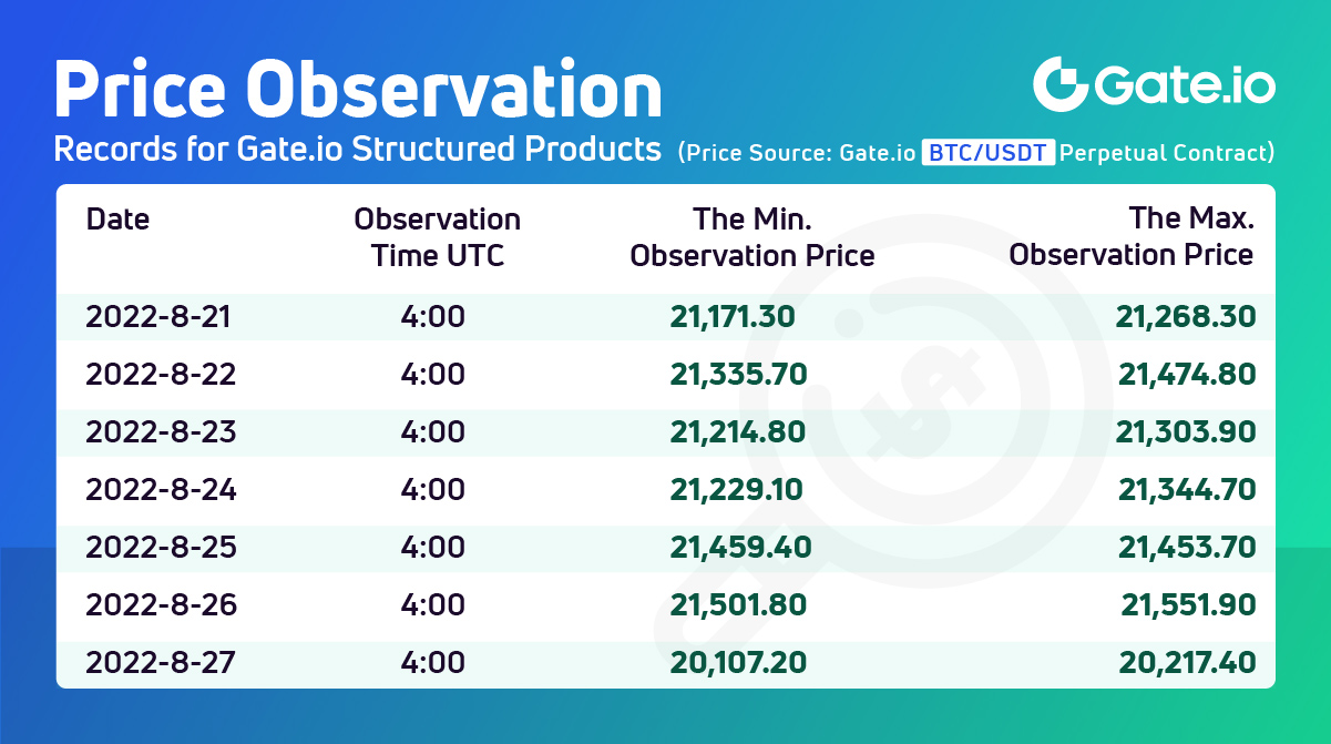 Gate launched "Bearish Sharkfin_BTC_20220820" and "Bearish Sharkfin_USDT_20220820" on August 19th on the structured products page. During the observation period, the BTC price always stayed within the per-specified price range [$19000 - $22000] and hit the high-yield range. Users who have successfully participated in these two products can get a high annualized income of 15.46% at settlement!