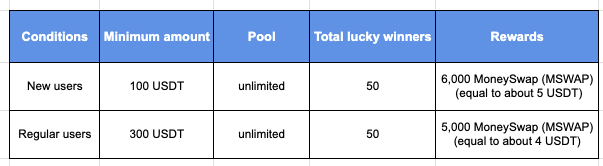 Participants in this activity need to complete gleam tasks. After the activity ends, 100 lucky users will be drawn to receive 3,500 MoneySway (MSWAP) (equal to $3) each.