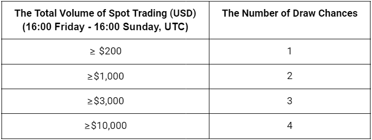Up to 4 chances can be won! With a total of $200 and more in spot trading from 16:00 UTC on Friday to 16:00 UTC on Sunday, participants will receive 1 draw chance.