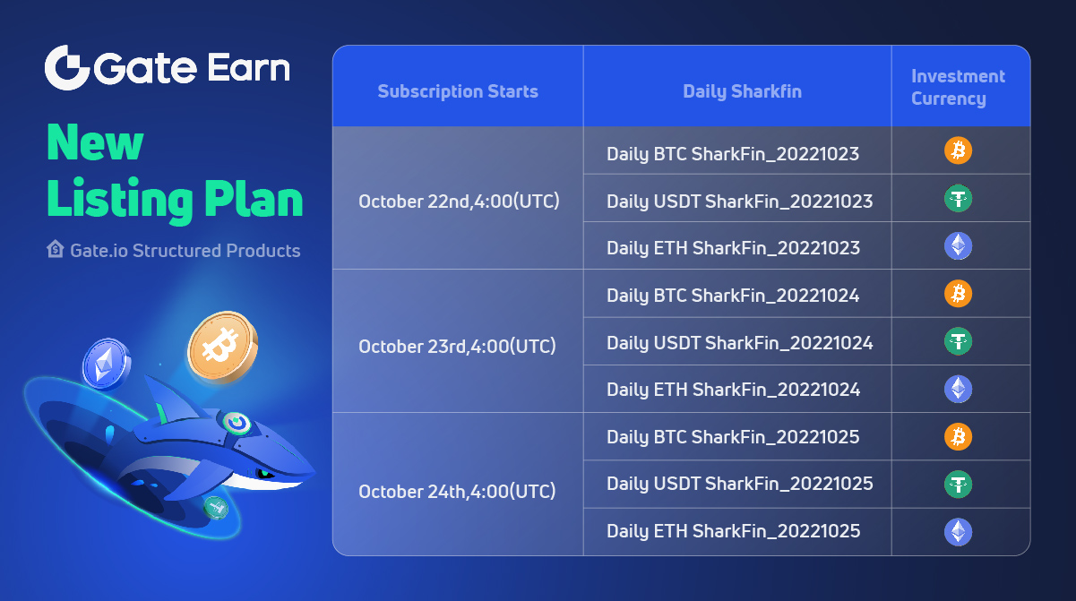 As of today, Gate listed three Sharkfin products, the Daily BTC & USDT SharkFin and Daily ETH SharkFin. They are principal protected and offer users a guaranteed return of 1% - 16%. The subscription starts at 04:00 on October 21st, 2022 (UTC). We welcome you all to participate!