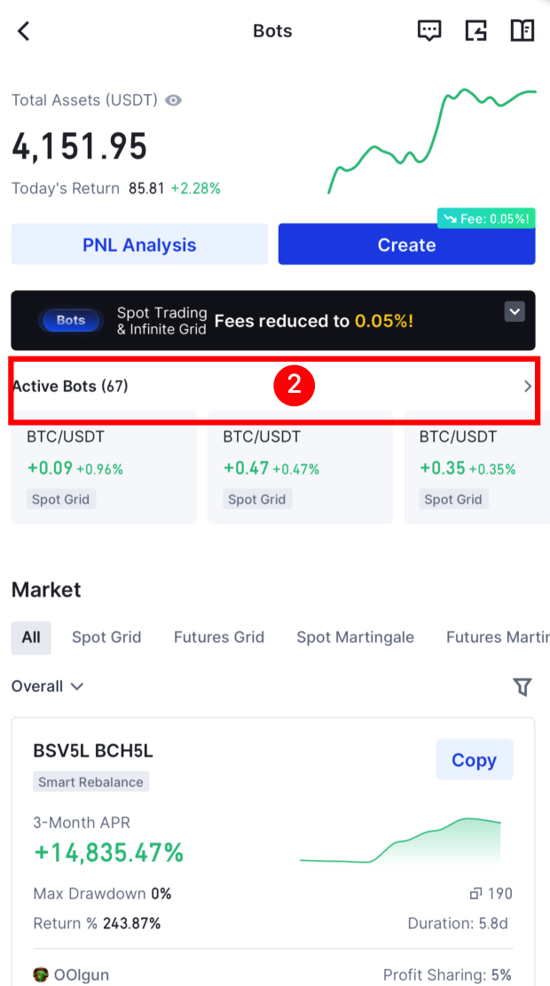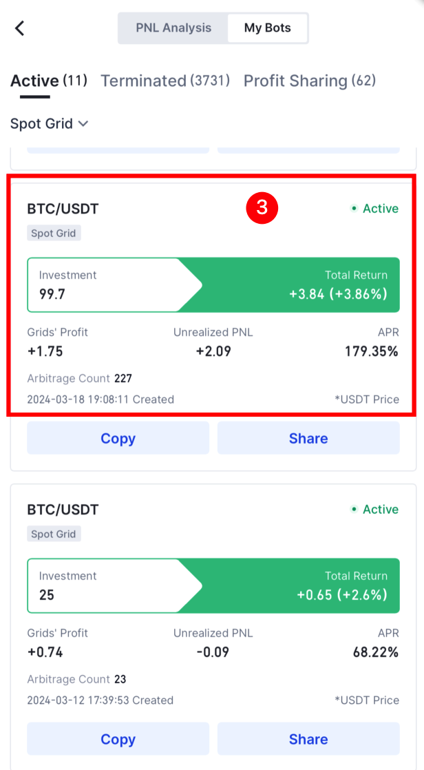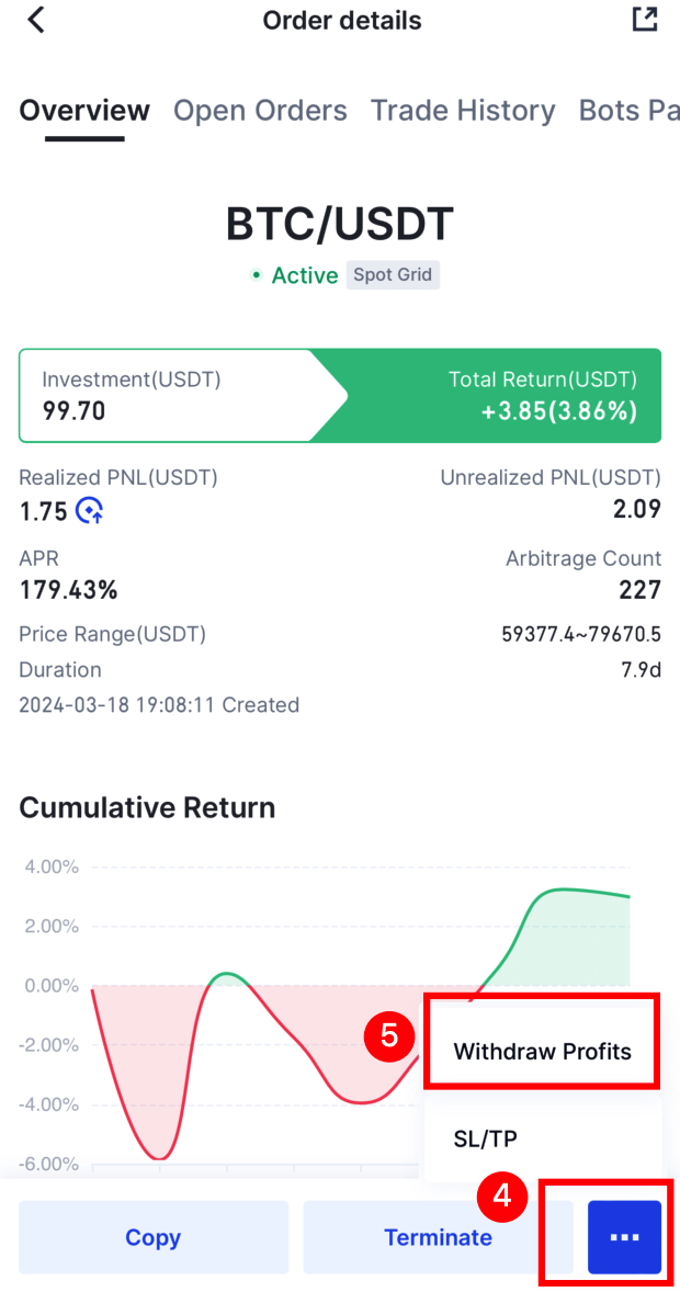 2. Tap on [Active bots], choose the Spot Grid bot in use, and enter its order details. Under more options, select 'Withdraw Profit'. Remember, if your bot is a copy with a sharing ratio above zero, the profit withdrawal isn't available yet.