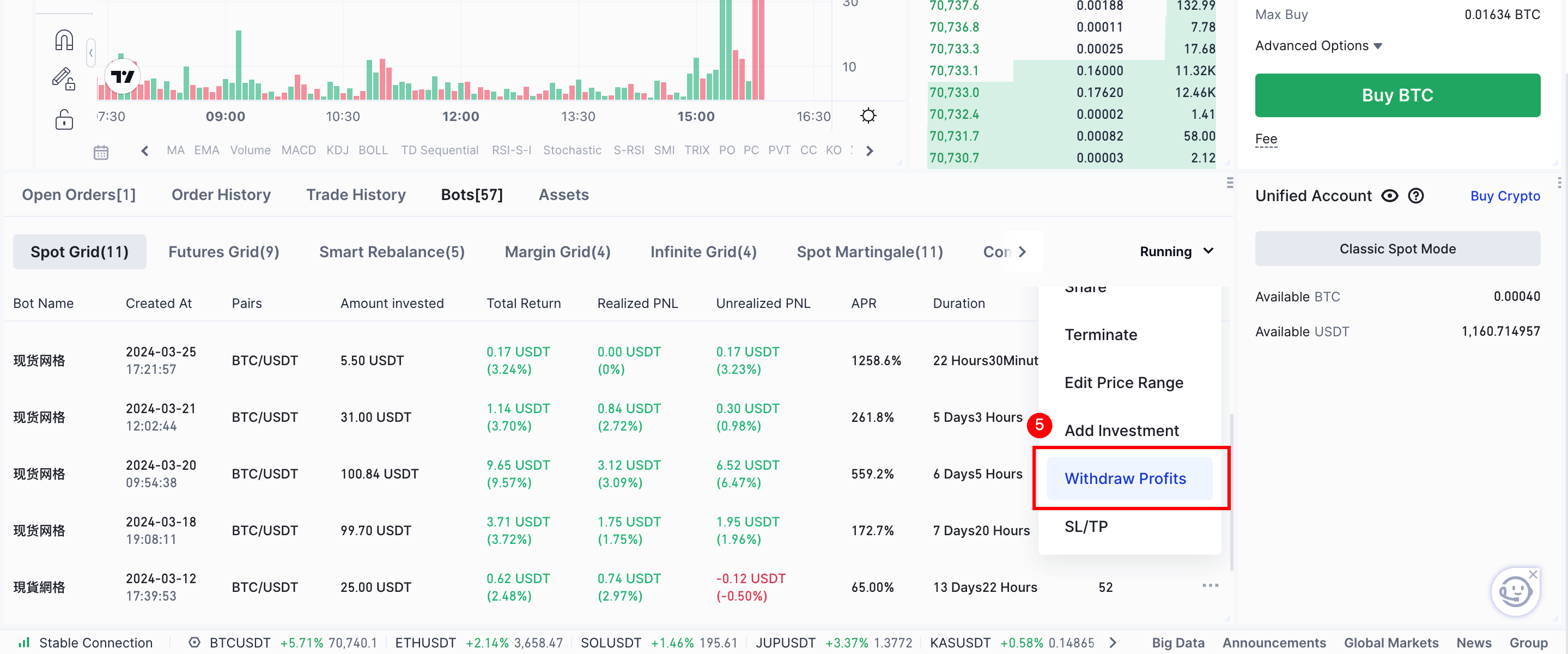 2. In your orders, go to [Trading Robot - Spot Grid - Operation - Withdraw Profit]. If your bot is a copied version with a profit-sharing ratio, please note that the profit withdrawal option is not currently supported.
