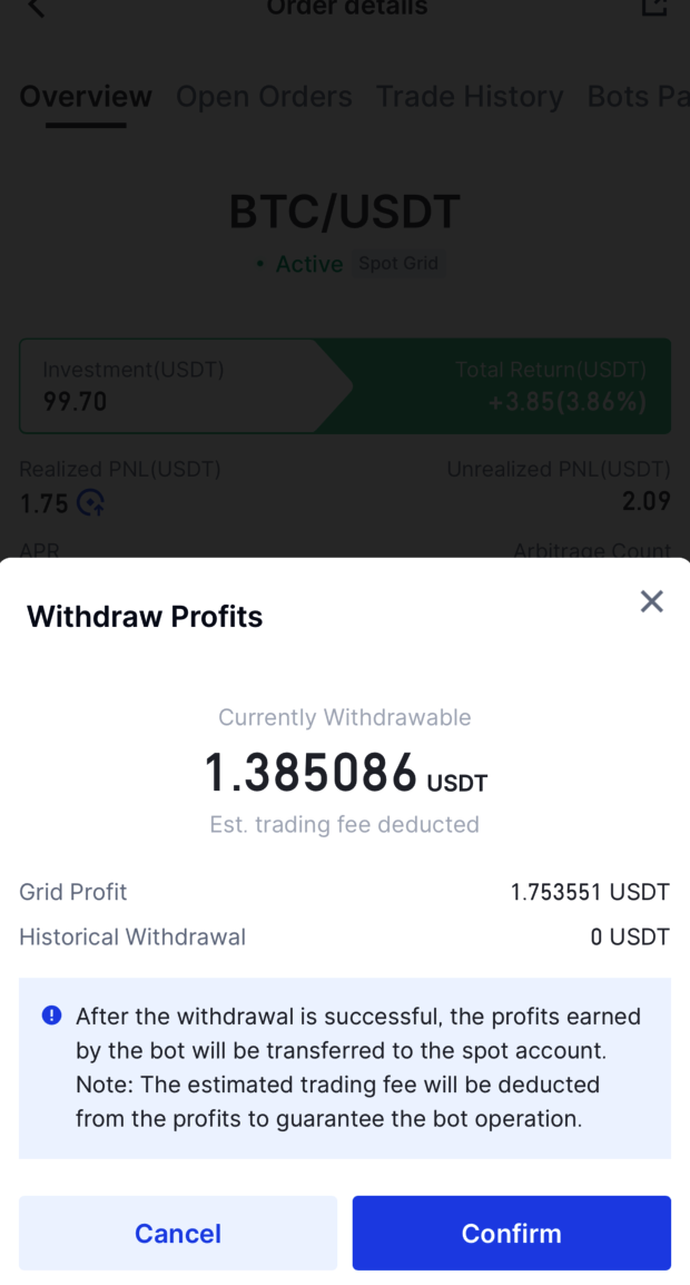 3. In the withdrawal pop-up, hit 'Confirm' to instantly move your eligible profits to your spot account. A small part will be deducted for ongoing bot operations, so the amount you can withdraw will be a tad lower than your total grid profits.