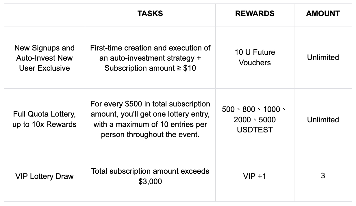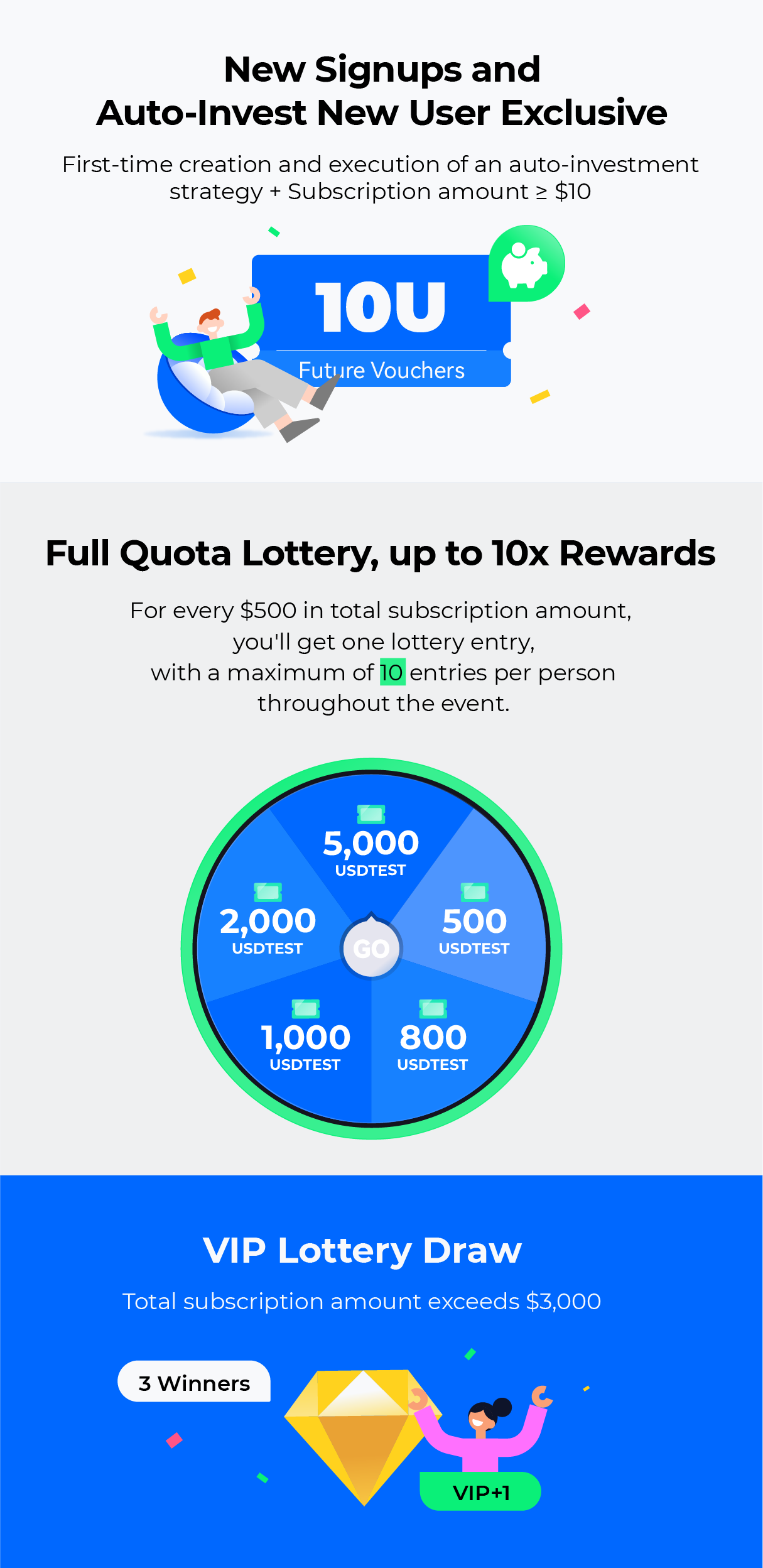 *Note: The total subscription amount refers to the cumulative transaction volume of Auto-Investment during the event, regardless of the number of transactions or the amount. For example, if Alice signs up for the event and subscribes to one Auto-Investment product for 10 U, and then subscribes to another product for 20 U, the total subscription amount for Alice during the event is 30 U.