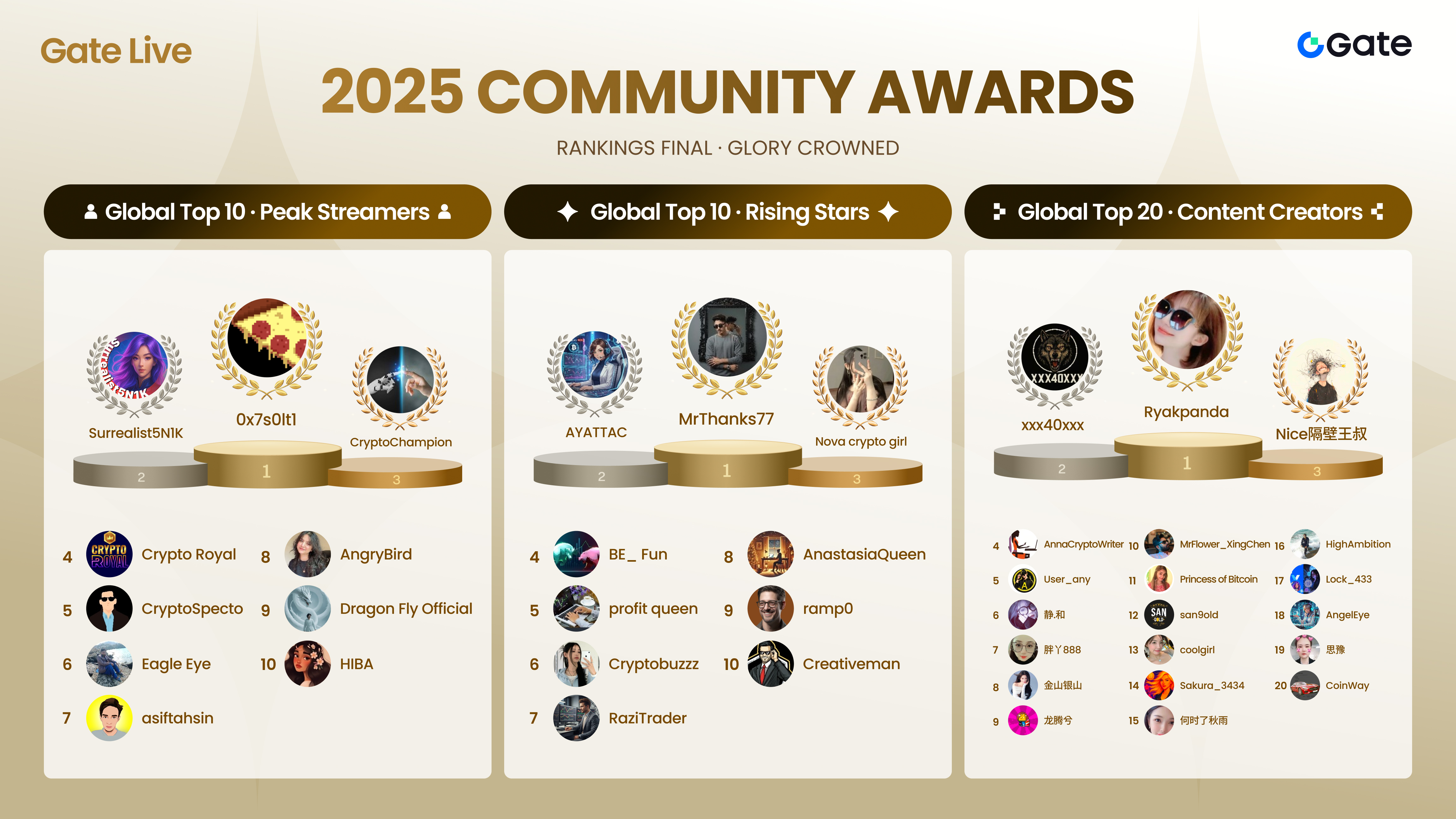 Gate officially announced the 2025 Year-End Community Gala Top Streamer and Content Creator Rankings on January 23. The rankings were determined through a comprehensive evaluation based on platform data and community performance, aiming to recognize creators who have demonstrated outstanding performance in live content creation and community influence.