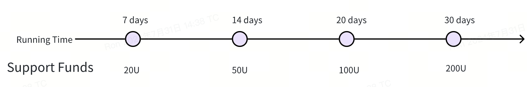 During the event, users who start effective bots (regardless of bot type and market) with running time meeting the check-in time requirements will win support funds: