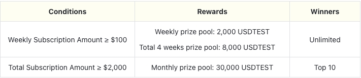 Etkinlik sonunda kullanıcıların İkili Yatırım ürünlerine yönelik toplam abonelik tutarını belirleyeceğiz. Kümülatif abonelik tutarı 2.000 USDT'ye ulaşan kullanıcılar, abonelik oranlarına göre 30.000 ABD Doları tutarındaki ödül havuzunu paylaşacak. Bu, ilk gelene ilk hizmet esasına göre ilk 10 uygun kullanıcıyla sınırlıdır.
