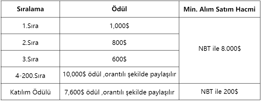 İşlem hacmine göre tüm uygun kullanıcılar 20.000$ değerinde NBT tokeni paylaşacak.
