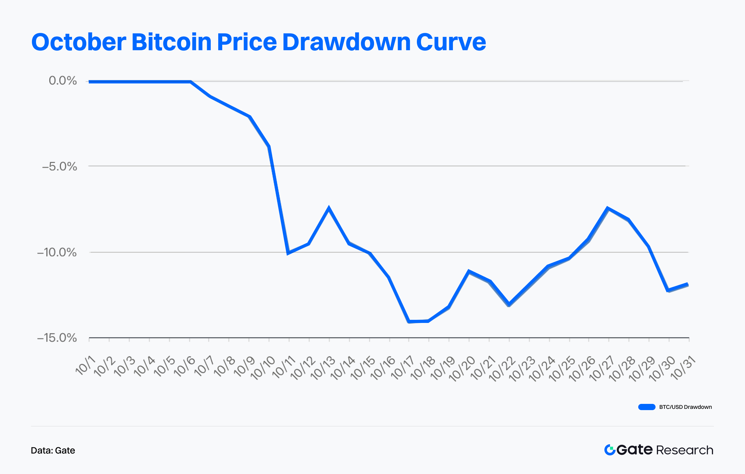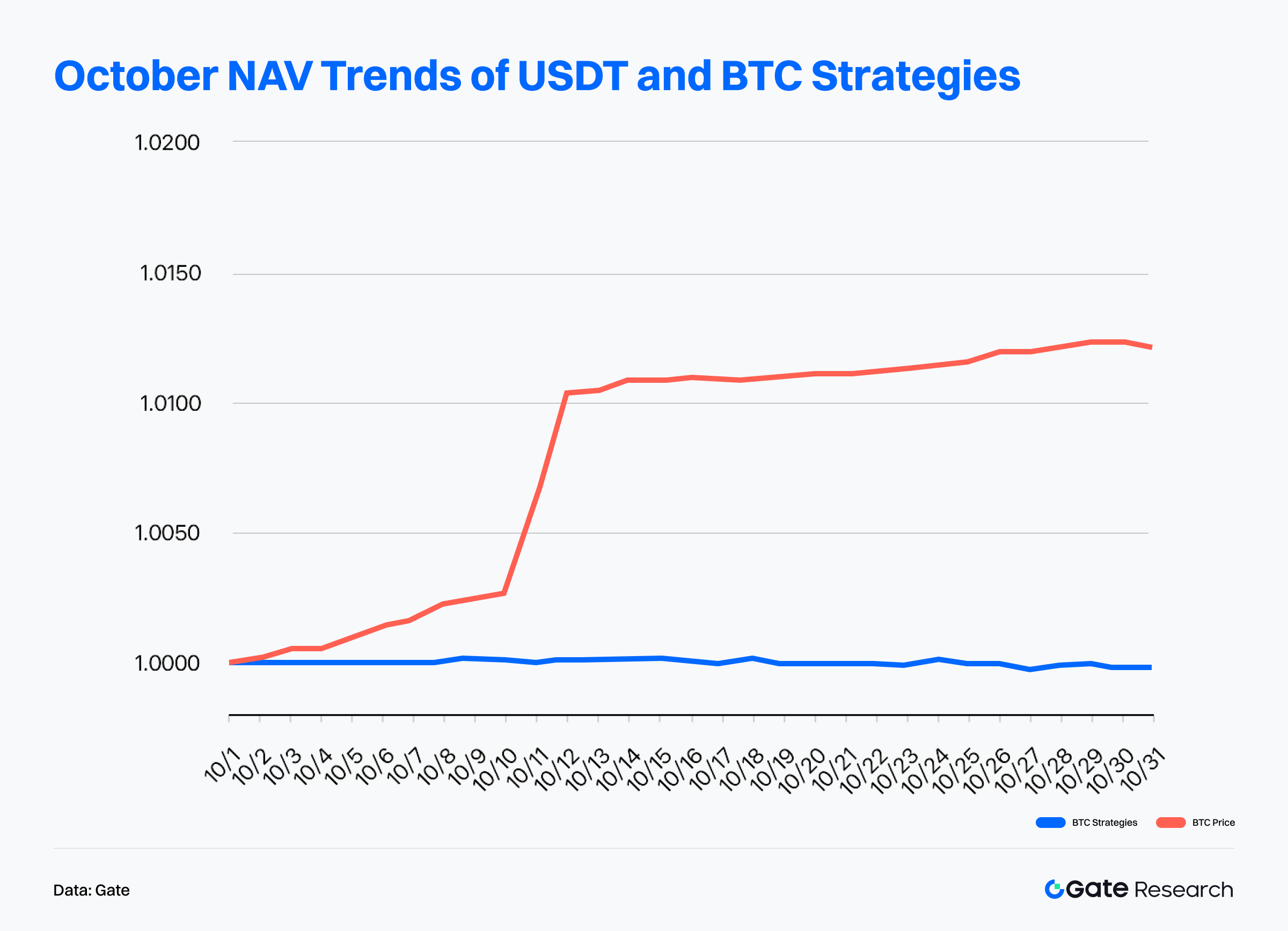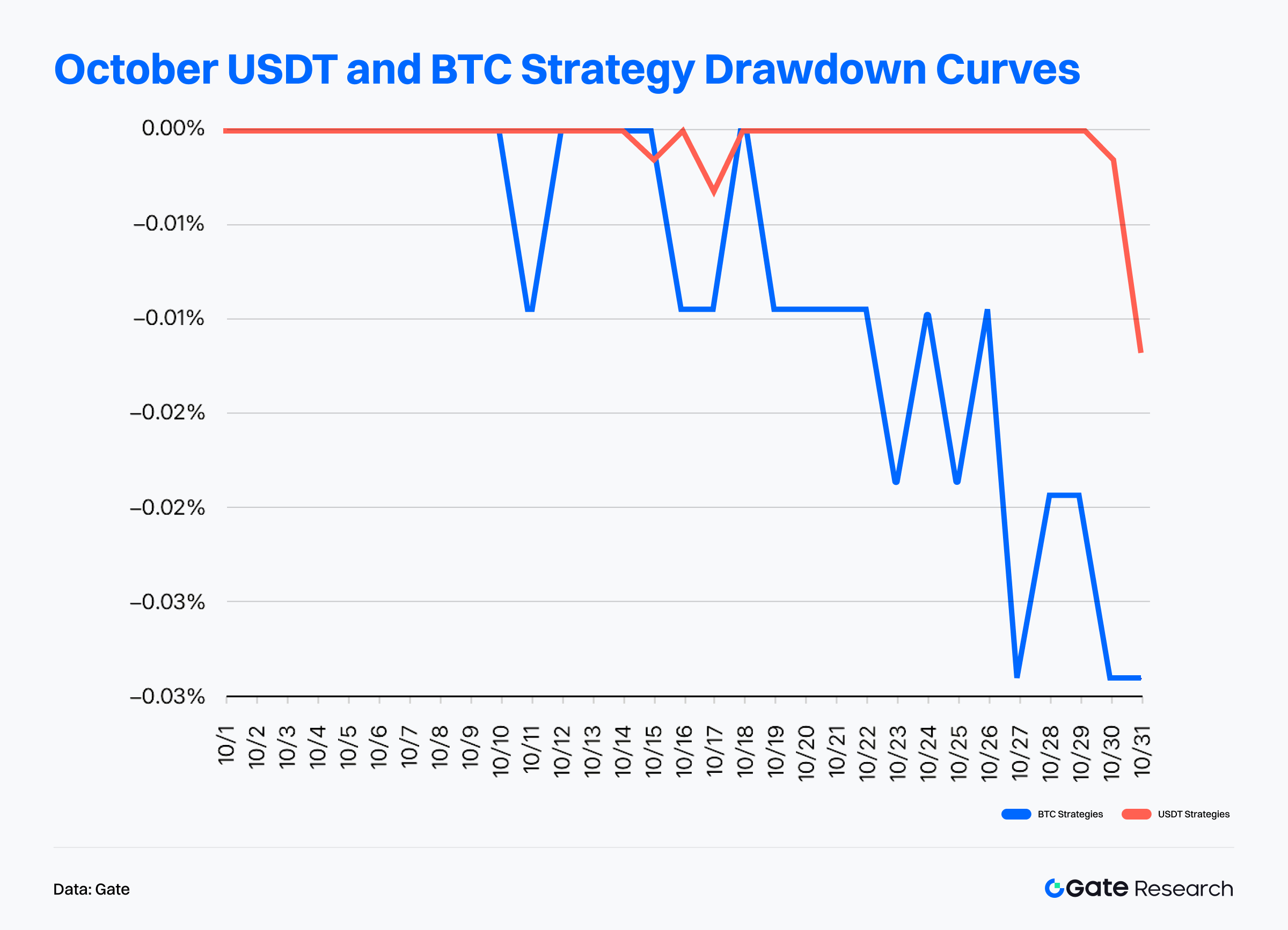 In October, the overall drawdown level of Gate’s quantitative funds remained low. The maximum drawdown for USDT strategies was only 0.01%, and for BTC strategies, 0.03%, demonstrating excellent risk control. In contrast, due to macro policy uncertainty and geopolitical events, Bitcoin’s maximum monthly drawdown once expanded to 14.1%. Although market sentiment improved temporarily in late October, narrowing Bitcoin’s losses to around 7.5%, risk appetite weakened again toward the end of the month, leaving the overall monthly drawdown at approximately 12%.