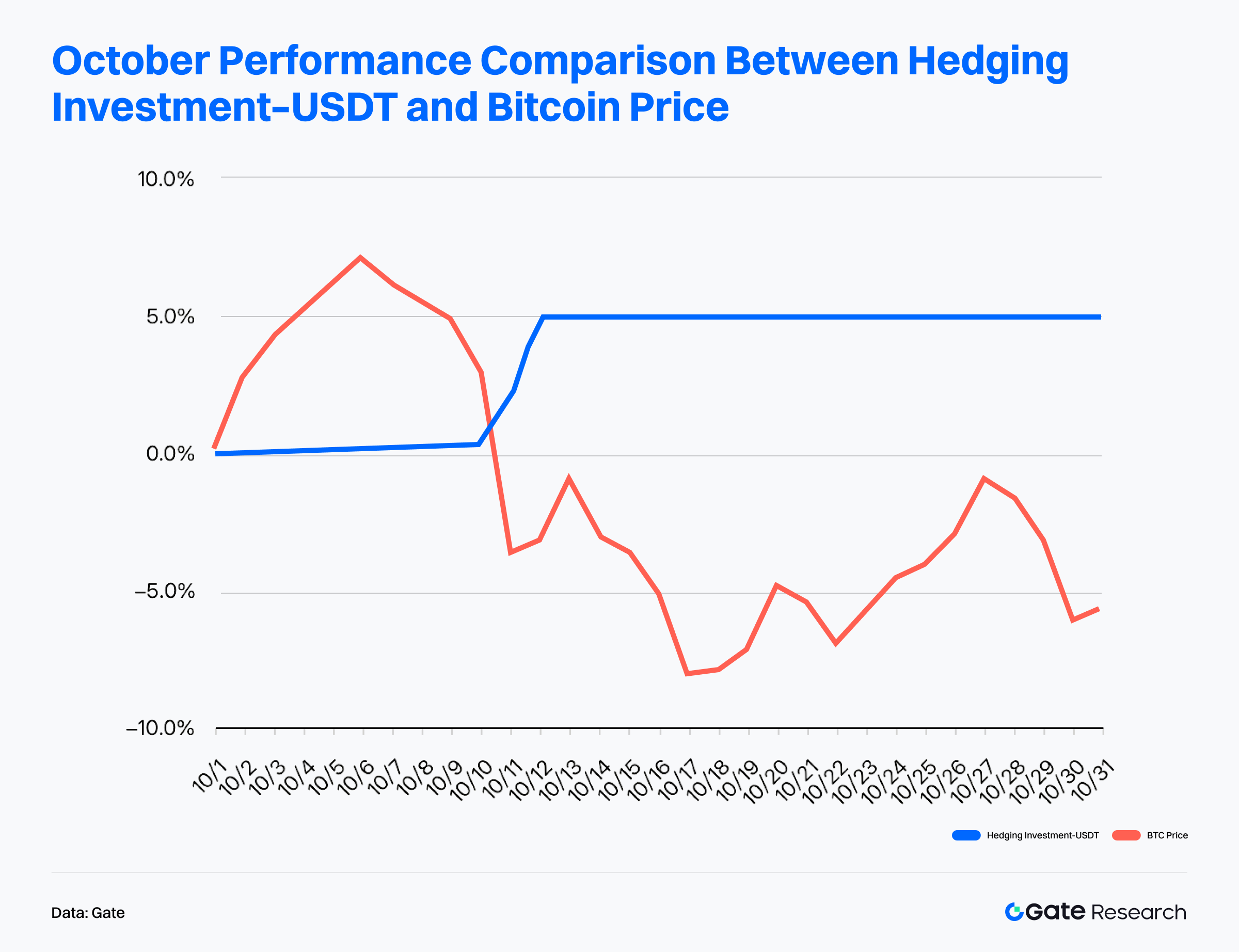 When compared with Bitcoin’s price trend, USDT strategies stood out with an average annualized return of 14.5% in October. Notably, Hedging Investment–USDT delivered exceptional performance—achieving a 5% positive return even as Bitcoin dropped over 5.5% during the month, showcasing its strong anti-volatility capability. The product recorded an annualized return of 59% in October and a 1-year return of 16.4%, ranking first among all quantitative products.