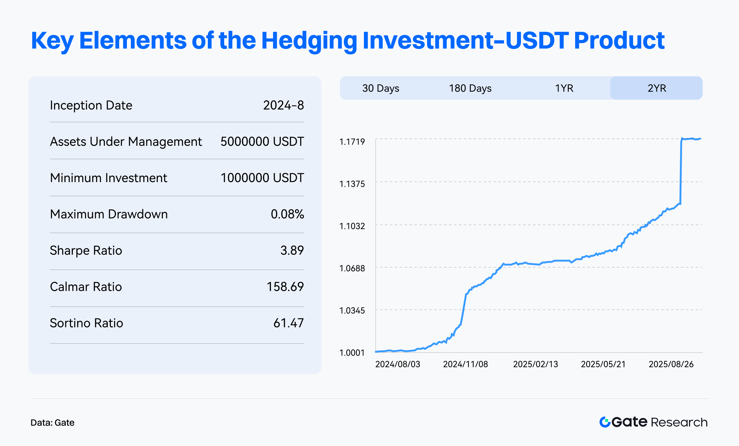 The Hedging Investment–USDT strategy primarily employs futures-spot arbitrage, funding rate arbitrage, and market-making arbitrage mechanisms to capture low-risk price spreads across markets and deliver high returns. Over the past two years, the strategy has maintained stable growth, with a Sharpe ratio of 3.89 and a maximum historical drawdown of only 0.08%. Its core team members are graduates of world-renowned universities and have held positions at leading global investment institutions, bringing deep expertise in quantitative research and risk management—making it ideal for investors seeking steady appreciation and diversified asset allocation.