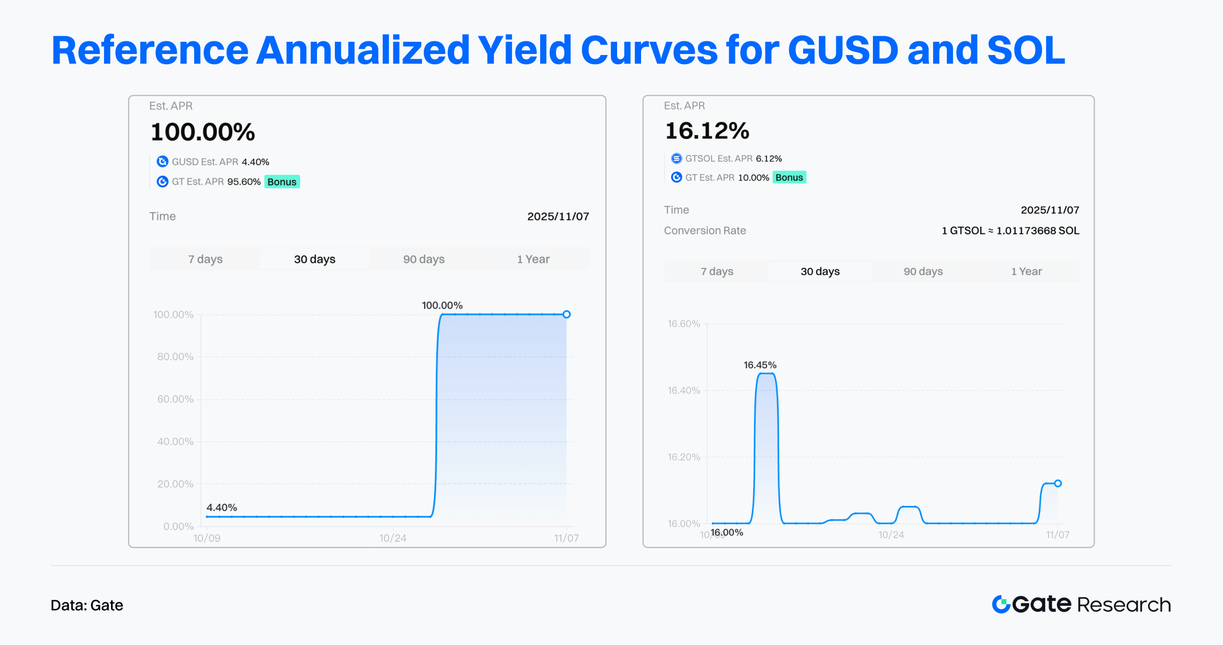 In October, Gate Earn maintained stable overall returns. Users holding USDT, BTC, and ETH also received additional bonus rewards from Gate. The annualized yield for USDT fluctuated between 2–5%, with an extra 9% annualized bonus offered by Gate, and new users eligible for up to 200% in additional rewards.