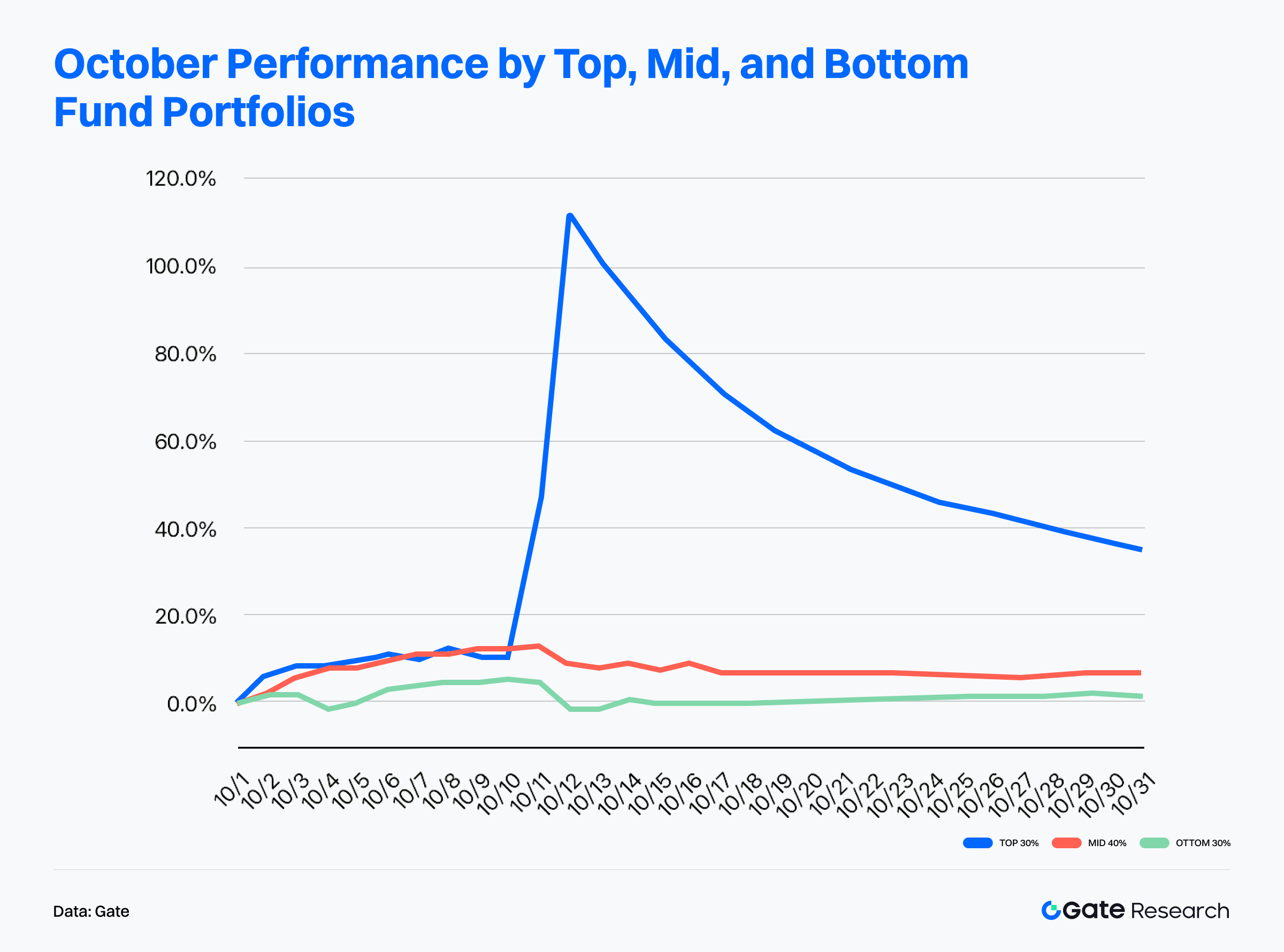Despite major cryptocurrencies experiencing overall downward fluctuations in October, the Top 30% portfolio achieved an impressive annualized return of 35.4%, significantly outperforming Bitcoin. The Mid 40% portfolio recorded an annualized return of 6.3%, exceeding the 10-year U.S. Treasury yield (4.14%). Even the Bottom 30% portfolio maintained a positive annualized return of 1.6%, reflecting robust and volatility-resistant strategy performance overall.