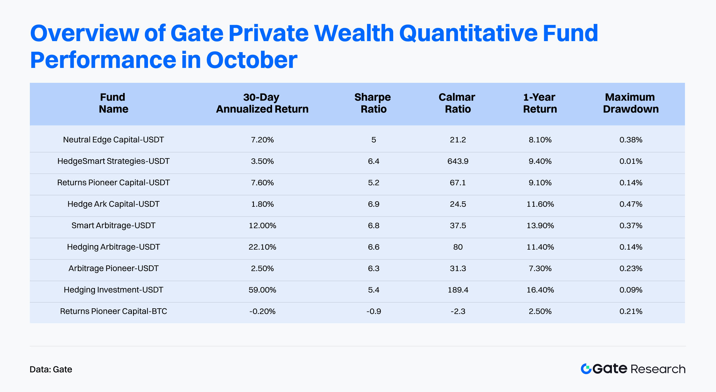 In October, all nine quantitative fund products available to Gate Private Wealth clients delivered stable and consistent performance. The fund managers primarily used USDT as the base currency due to its high liquidity, price stability, and security, as well as its greater flexibility in executing trading strategies.
