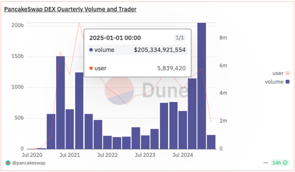 PancakeSwap’tan alınan bilgilere göre, 2023’ün birinci çeyreğinden 2025’in birinci çeyreğine kadar, borsada işlem hacmi %921 oranında artmıştır. Bunun yanında, kullanıcı sayısı %81,25 artarken, platformda gerçekleştirilen işlem sayısı ise %159,41 oranında güçlü bir artış göstermiştir.