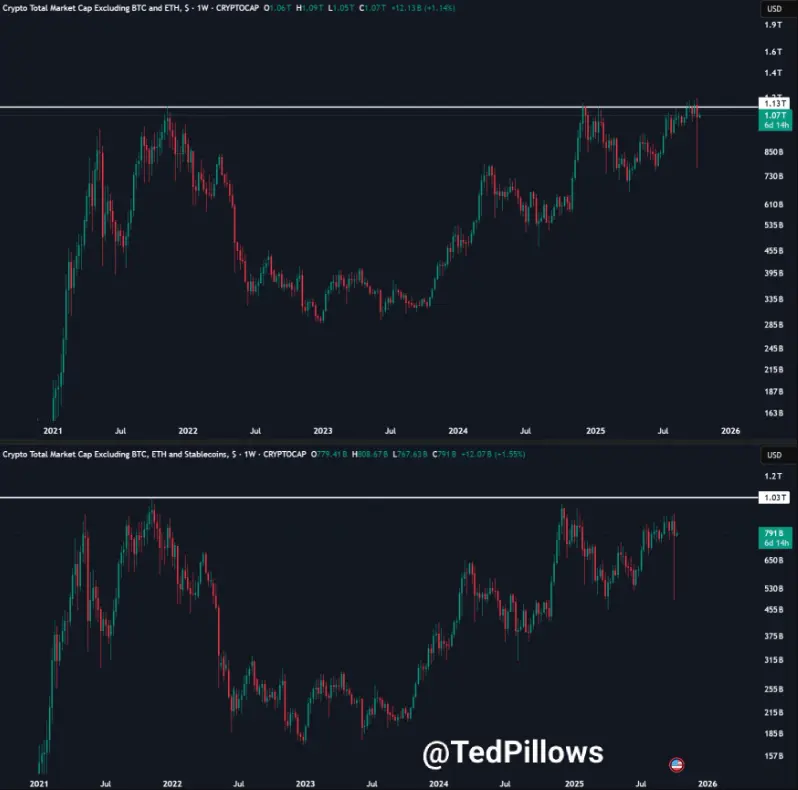 Ted, dikkatli bir görüş belirterek, piyasanın henüz gerçekten altcoin sezonuna girmediğini belirtti. Altcoin grubunun toplam piyasa değeri ( stablecoin) hariç, tarihi zirvenin yaklaşık %20 altında kalmaya devam ettiğini vurguladı — bu, Bitcoin ve Ethereum'un altcoin dalgasının patlak vermesi için güçlü bir fiyat artışı yaratması gerektiğine dair bir işaret.