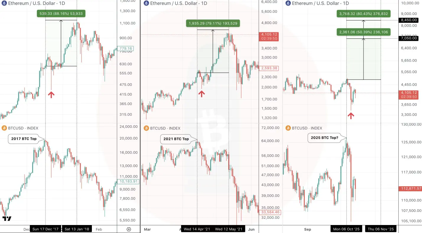 ETH'in 2017 ve 2021 fiyat döngüsü | Kaynak: CryptoBulletBununla birlikte, herkes Bitcoin'in liderlik etmesi gerektiği görüşünde hemfikir değil. Analist CryptoBullet, geçmişte ETH'nin Aralık 2017'de %88 ve Nisan 2021'de %79 arttığını, BTC'nin zirveye ulaştıktan hemen sonra olduğunu savunuyor — Ethereum'un, Bitcoin'in ivmesine bağımlı olmadan kendi büyüme dinamiğini yaratabileceğinin bir kanıtı.