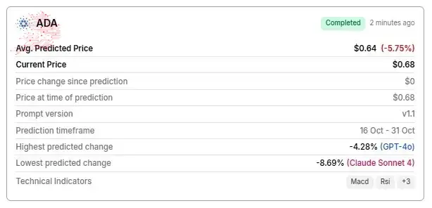 ADA Ekim 2025 tahmini. Kaynak: Finbold SignalsTahminde kullanılan tüm LLM'ler kesinlikle düşüş yönlüydü. Claude Sonnet 4, Cardano'nun en düşük fiyatını $0.62 (-8.69%) olarak tahmin etti, Grok 3 ve GPT-4o ise bunun $0.65 (-4.28%)'a kadar düşebileceğini öne sürdü.