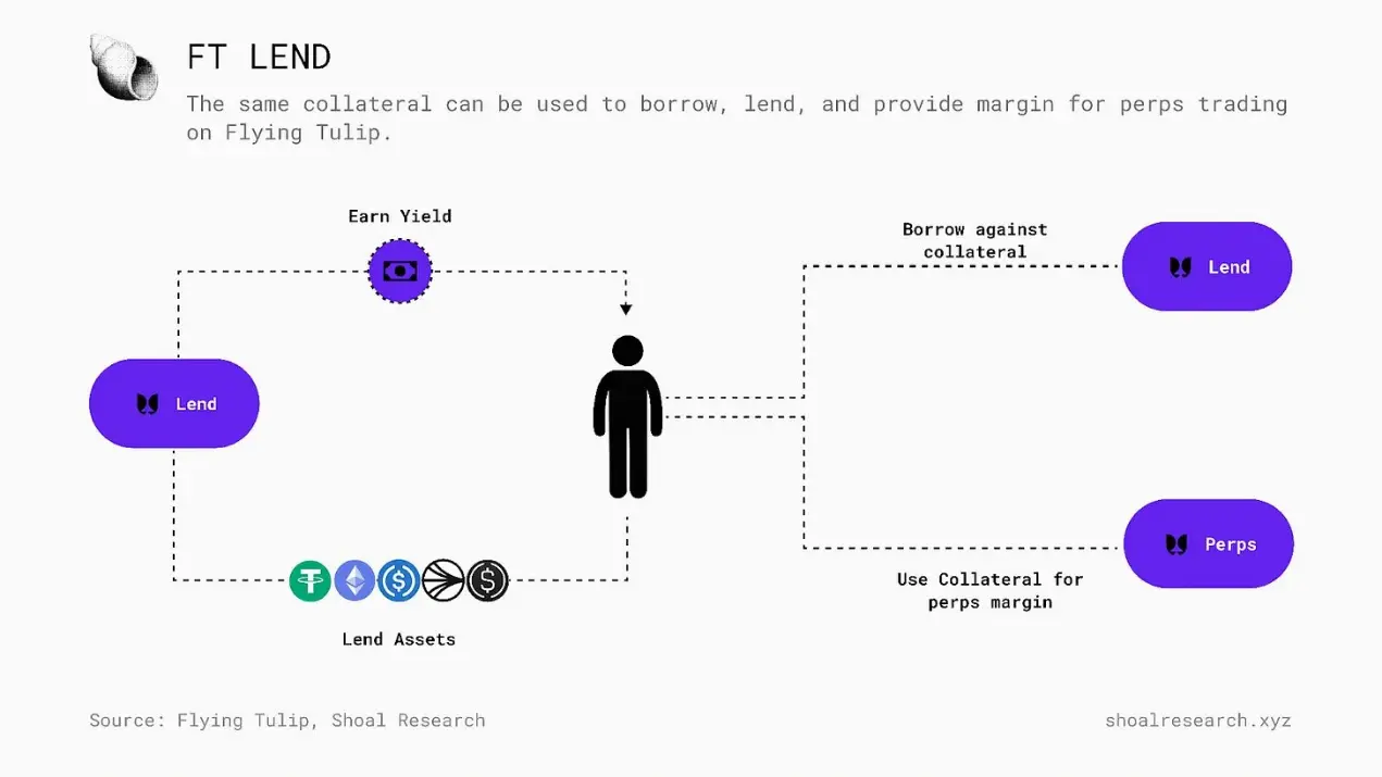 Flying Tulip 推出了 FT Lend,这是一种直接集成到协议统一保证金系统中的原生货币市场。它允许用户使用相同的抵押品借入和借出资产,该抵押品支持整个协议的交易、结算和衍生品头寸。 FT Lend 的设计初衷是在一个自适应框架内运行,该框架基于流动性深度和波动性的实时市场数据。