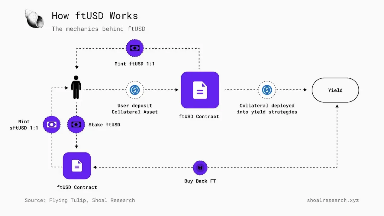 ftUSD 通过 delta 中性策略维持与美元的挂钩,即 ftUSD 的抵押品在链上部署以赚取收益,同时将对市场波动的净敞口保持在接近零的水平。ftUSD 的收益主要来自货币市场(如 Aave)中提供的抵押品所赚取的利息,以及对冲头寸多头部分产生的质押奖励。头寸会定期重新平衡,并受到上限、规模区间和交易场所限制的约束,以保持偿付能力和降低波动性传导。
