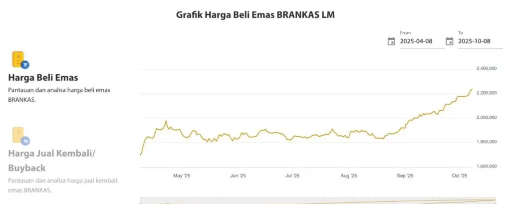 Son altı ay boyunca altın alım fiyatının grafiğine bakarsanız ( Nisan'dan Ekim 2025)'a kadar, tutarlı bir yukarı eğilim görebilirsiniz. Resmi platformdan alınan verilere göre, altın fiyatı Nisan başında Rp1.800.000-Rp1.900.000/gram aralığındaydı ve şimdi Rp2.200.000/gram'ı aşmış durumda. Bu, altının daha istikrarlı bir yatırım aracı olarak önem kazandığını gösteriyor.