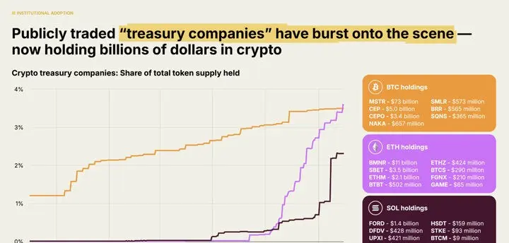 Veriler, halka açık tahvillerin artık en büyük üç ağdaki toplam token arzının ölçülebilir bir yüzdesini kontrol ettiğini gösteriyor - Ekim 2025 itibarıyla Bitcoin'in yaklaşık %3'ü, Ethereum'un %2,5'i ve Solana'nın %1,5'i. Bu, Bitcoin'in 2021 ETF döngüsünden bu yana kurumsal birikimin en hızlı temposunu temsil ediyor.