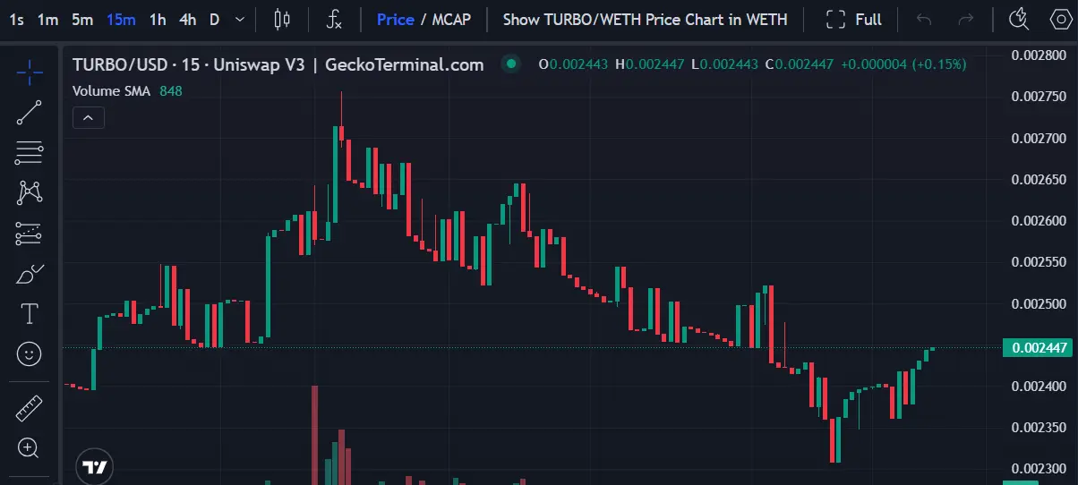 Turbo is currently priced at $0.00244, showing a minor 0.8% daily decline but maintaining stability around this support zone.