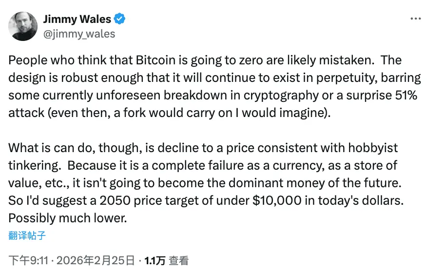 Wikipedia co-founder Jimmy Wales shared his decades-long perspective on Bitcoin’s future on social media. He clearly states that although the Bitcoin network itself is designed to be robust and unlikely to disappear easily, its functions as a currency and store of value have “completely failed.” Therefore, he predicts that by 2050, based on current valuations, BTC could be worth less than $10,000, or even lower. He views Bitcoin merely as a speculative asset and sees no signs of widespread adoption yet.