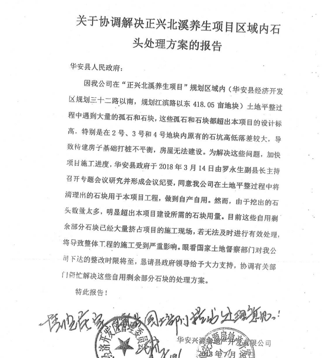 On March 14, 2018, the company formally submitted a report to the Huian County People’s Government, detailing the challenges in land leveling and requesting approval to clear isolated stones and boulders, promising that the cleared stones would be “self-produced and self-used, never sold externally.”