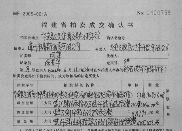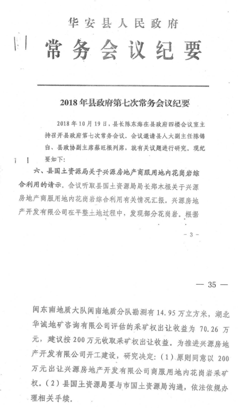 On October 19, 2018, the Huian County Government held its seventh executive meeting, specifically studying the comprehensive utilization of granite from this plot. The meeting accepted the survey results from the Fujian Southeast Geological Team and the assessment report issued by Hubei Huacheng Geological Mining Consulting Co., Ltd.—which determined that the revenue from the granite mining rights transfer was 702,600 yuan—and ultimately decided to “transfer the granite mining rights within this plot for 2 million yuan.”