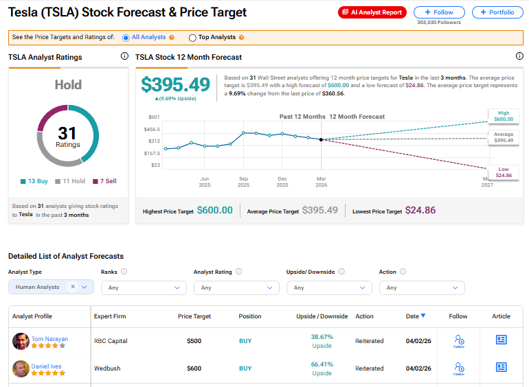 Tesla’s stock has a consensus Hold rating among 31 Wall Street analysts. That rating is based on 13 Buy, 11 Hold, and seven Sell recommendations issued in the last three months. The average TSLA price target of $395.49 implies 10% upside from current levels.
