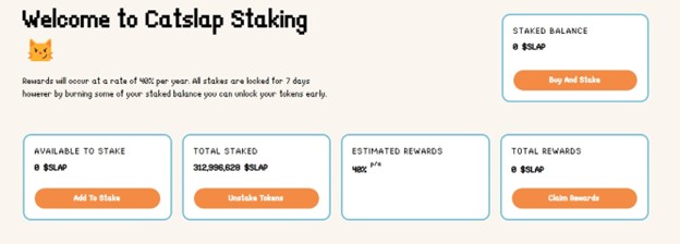 The token’s website also lets its users stake SLAP, currently offering a 40% staking APY. The staked tokens remain locked for seven days, but holders can pull them out of the pool early by burning some of their token holdings in the process.