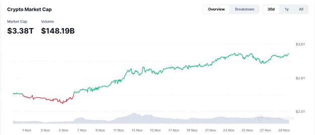 November has seen the broader crypto market cap grow by more than $1 trillion following the election of Trump’s pro-crypto government on November 5th