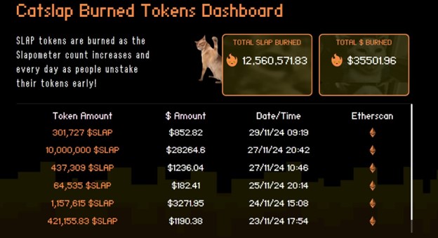 CatSlap’s website now features Slapometer, a tracker that displays the number of burned tokens. After burning another 300,000 tokens today, that number stands at 12.5 million, and it could increase the value of the remaining SLAP tokens in circulation.