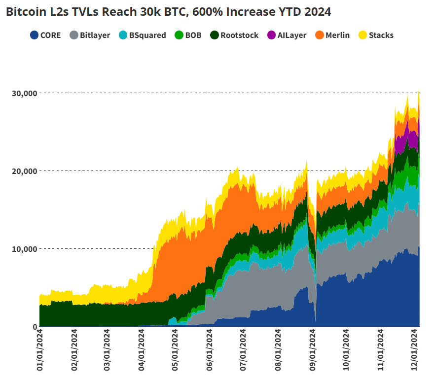 Bitcoin Layer-2 (L2) total value locked (TVL) reached 30,000 BTC in 2024, marking a 600% year-to-date growth. CORE and Bitlayer contributed significantly to TVL growth, followed by BSquared, BOB, and Rootstock