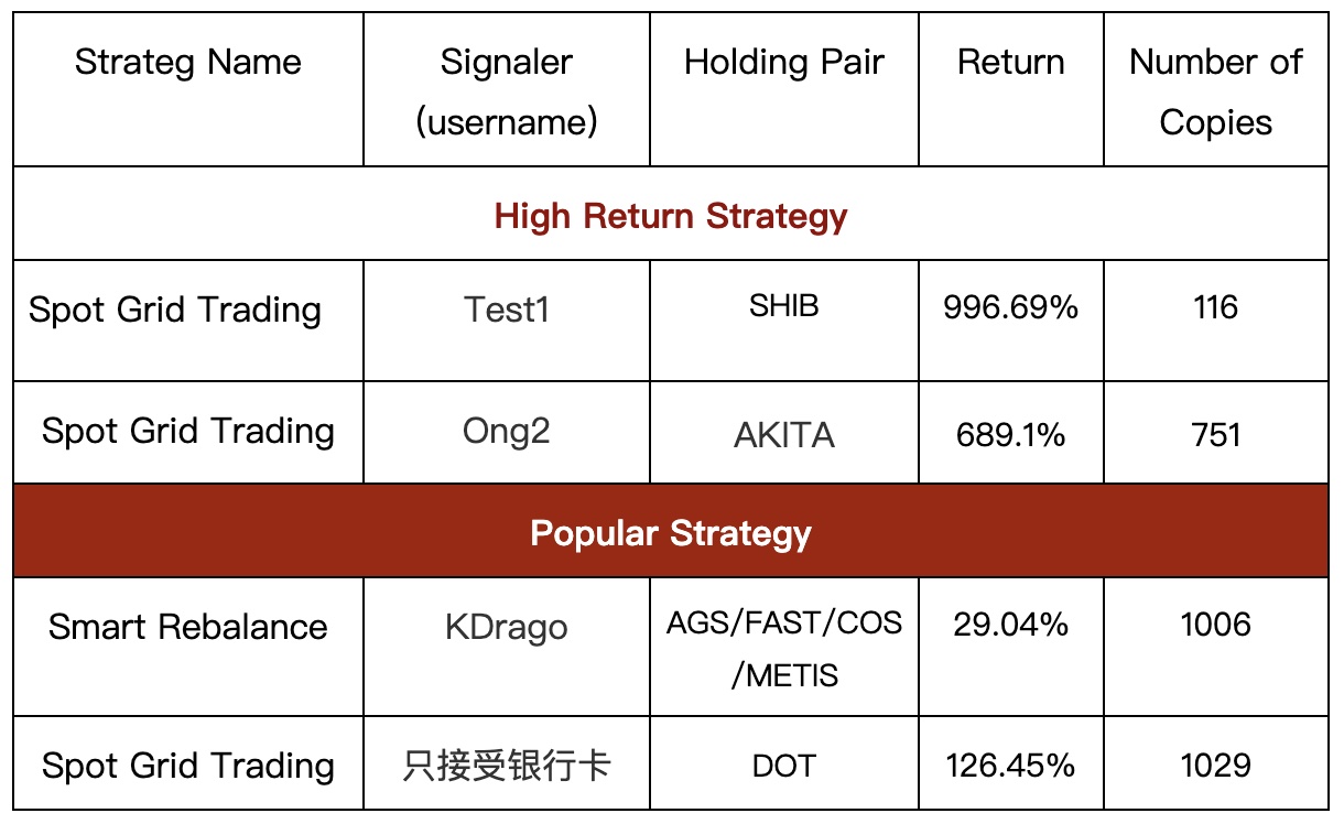 Users can view the performance of strategies created by other users in the leaderboard, and if they think a strategy has a better return than their own, they can copy a creator's strategy parameters to create an individualized version. All strategies are free to copy and 5% of the earnings will be returned to the signaller after the strategy is terminated.