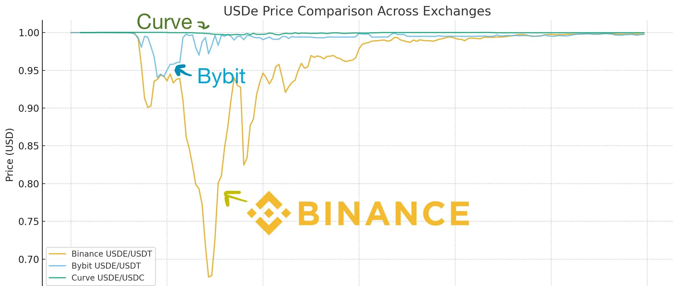 Том Коен, керівник інвестицій та торгівлі в кількісній крипто-активній управлінській компанії, сказав, що “початок можна відстежити приблизно до $60–$90 мільярдів USDe, які одночасно були скинуті на великій біржі, щоб скористатися неправильним ціноутворенням, і це спричинило серію великих продажів.” Він сказав, що “цей розпродаж дуже швидко вплинув на тонко торговані ринки.”