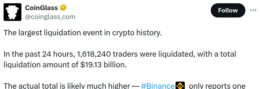Дані вказують на те, що в п'ятницю відбулося ліквідацій на суму 16,7 мільярда доларів США за довгими позиціями і 2,456 мільярда доларів США за короткими позиціями, що є найбільшою ліквідаційною подією в історії криптовалют.