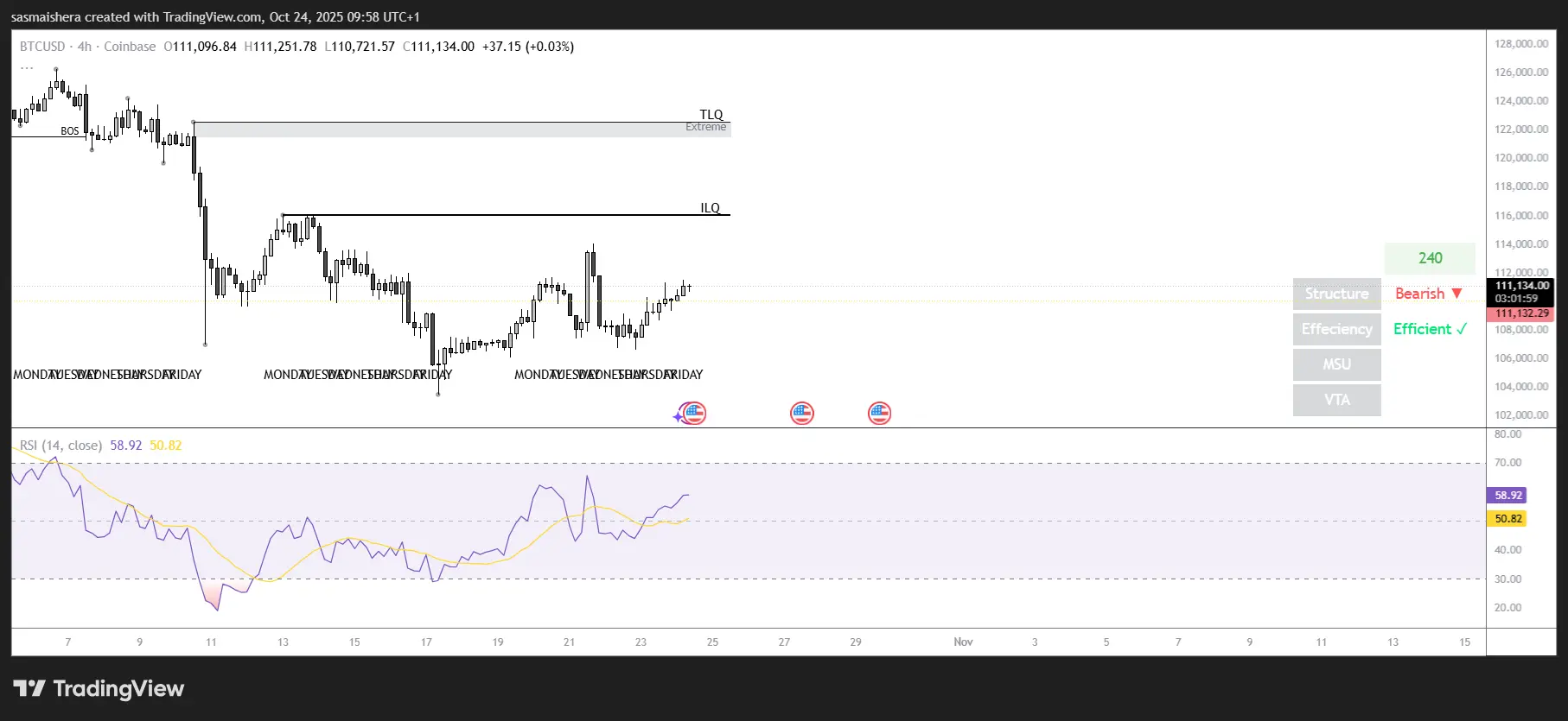 Графік BTC/USD на 4 години залишається ведмежим і ефективним, незважаючи на те, що ціна Bitcoin зросла на 1% за останні 24 години. Ціна криптовалюти Bitcoin зазнала відмови від 50-денної експоненційної середньої (EMA) на рівні $113,329 на початку цього тижня і впала майже на 3% у середу.