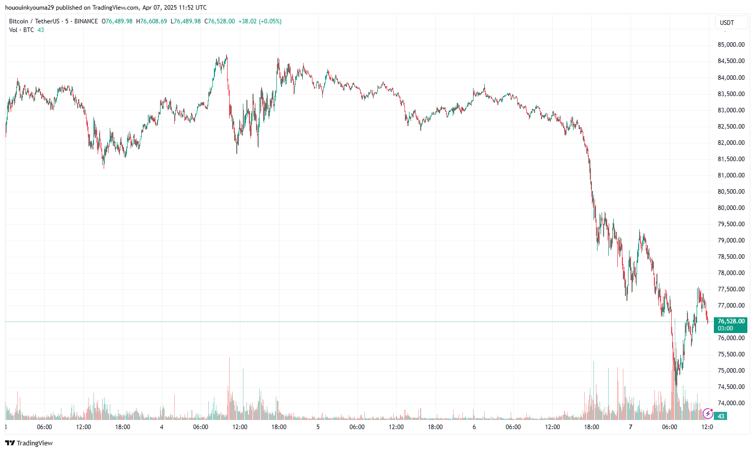 Біткойн розпочав новий тиждень з падіння майже на 7%, що знизило його ціну до $76,500.