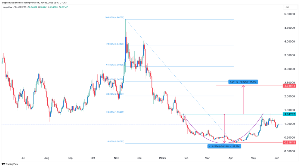 Щоденний графік показує, що ціна Dogwifhat досягла дна на $0.3185 у квітні, коли більшість мем-монет Solana впали. Тепер вона відновилася і збирається перетнути важливу точку спротиву на $1.