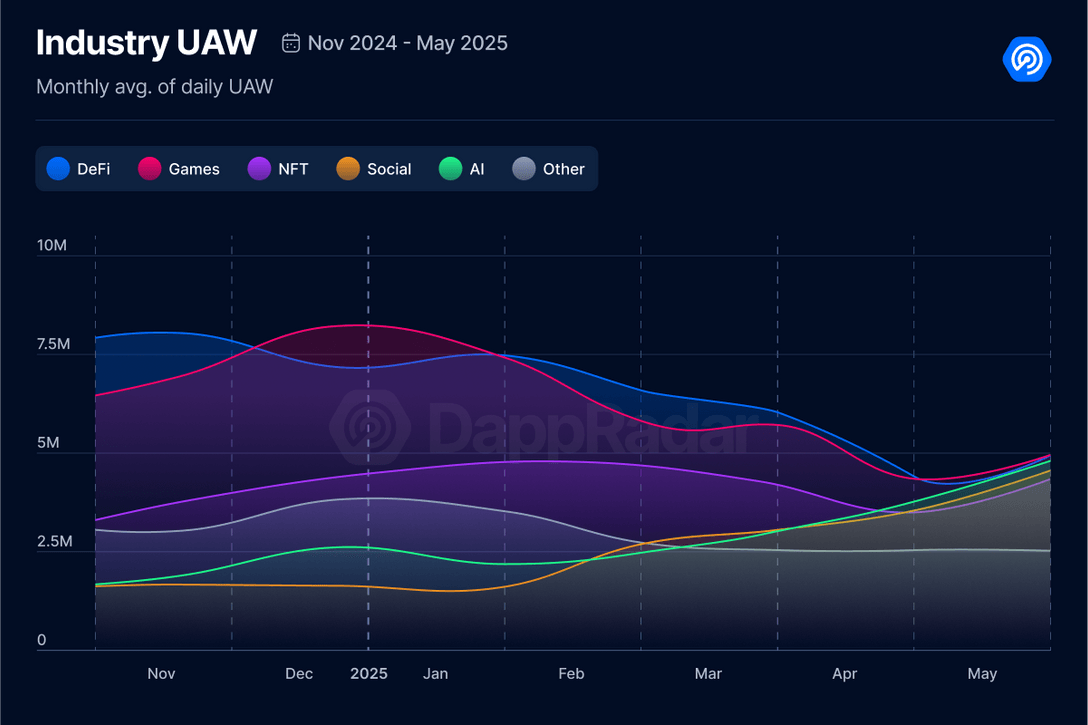 Май є ключовим місяцем для екосистеми dapp, що знаменує собою повне відновлення та зрілість динаміки галузі. Кількість активних гаманців на день досягла 25 мільйонів, а участь користувачів має зростаючу тенденцію, що зумовлено зростанням у ключових вертикальних галузях, таких як DeFi, NFT, AI та соціальні мережі.
