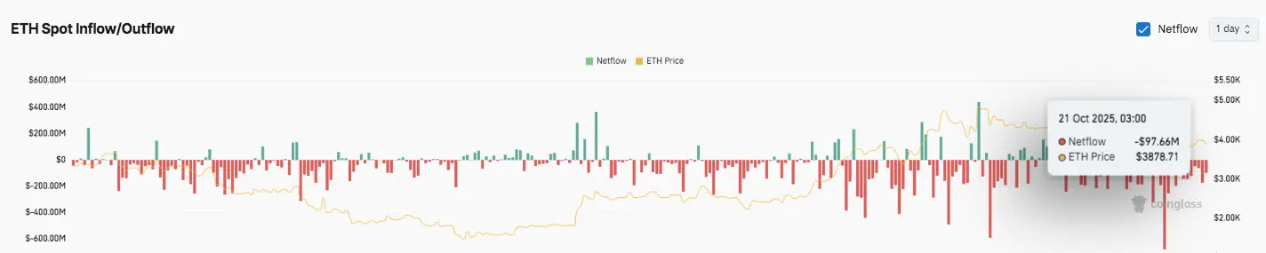 Більше того, спотові відпливи Ethereum домінували в жовтні, з майже 97,6 мільйона доларів, що вийшли з бірж 21 жовтня. Ці постійні відпливи свідчать про те, що інвестори переміщують активи на самообслуговування або стейкінг, що сигналізує про зменшення пропозиції на біржах. Історично такі патерни передують середньостроковим відновленням, коли продаж стабілізується.
