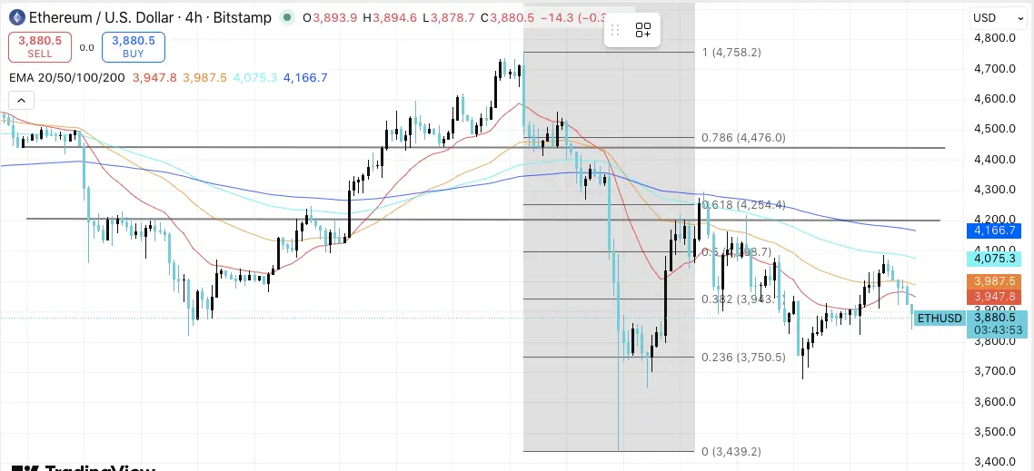 Ефіріум (ETH) демонструє відновлену волатильність, оскільки трейдери спостерігають за як ціна компресія, так і внутрішня напруга в спільноті розвиваються. Після того, як не вдалося утримати імпульс вище $4,254 Фібоначчі опору, ETH увійшов у коригувальну фазу, консолідуючись нижче ключових експоненціальних ковзних середніх (EMAs). 20-EMA на $3,947, 50-EMA на $3,987 і 100-EMA на $4,075 тепер утворюють критичні зони опору, які обмежують відновлення. Загальний тренд залишається обережним, оскільки ринкові настрої змінюються на фоні зростаючої активності деривативів та суперечок між розробниками.